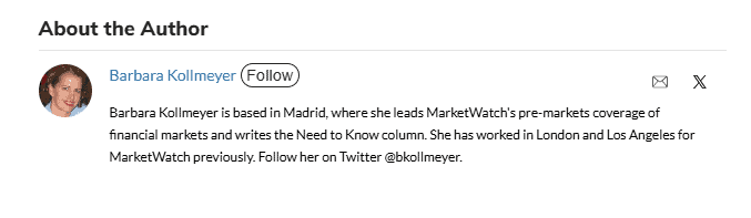 MarketWatch is all business when it comes to their bios. They provide a concise professional background on the writer and a few options for reaching them. This aligns with their brand as a premium destination for professional market news that readers can trust.